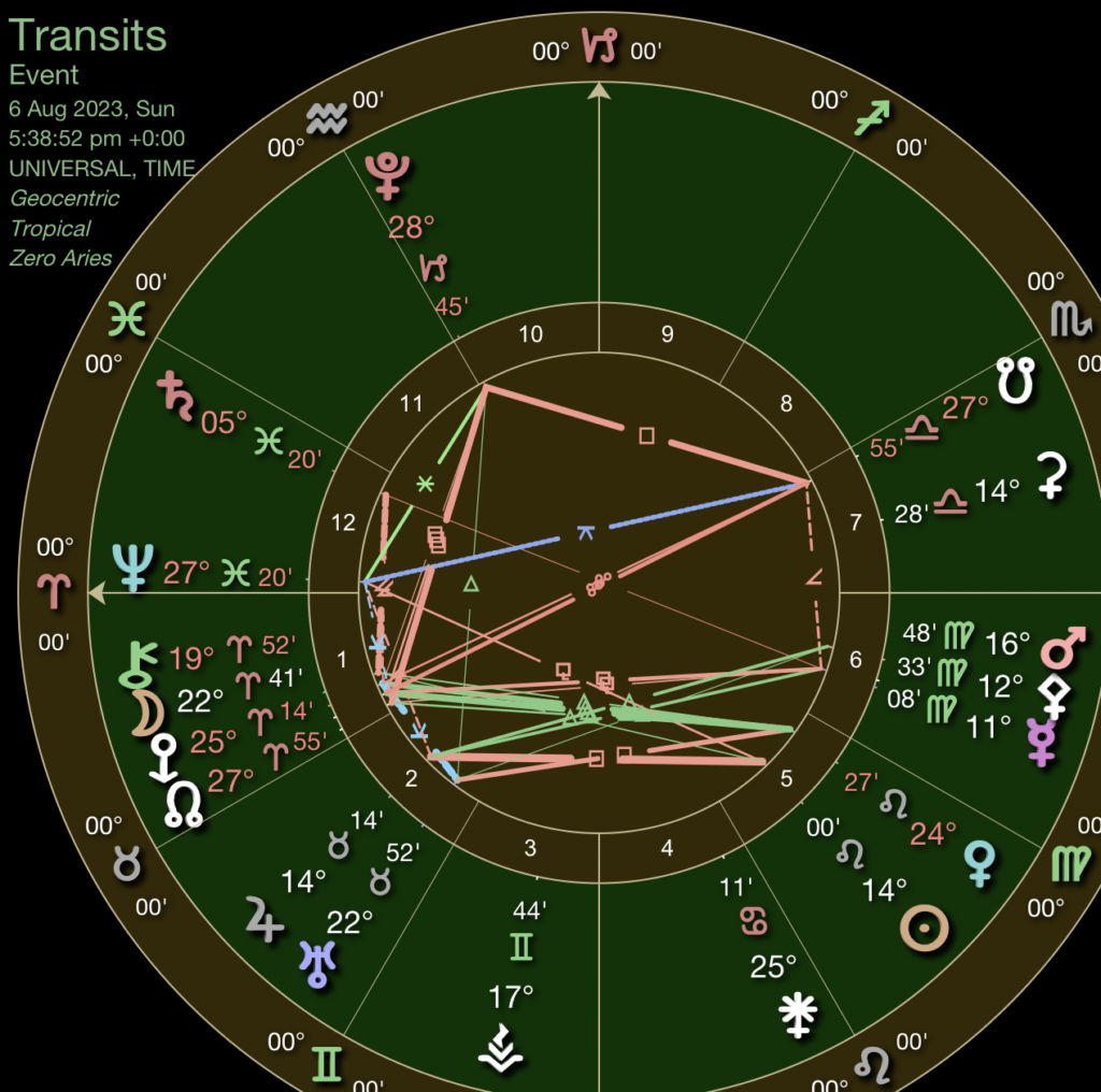 The Moon is currently in the later stages of Aries, working up a fiery, feisty mood. It passes between Chiron and Eris, which are invisible to the naked eye but still have a powerful influence on our emotions. Saturn in Pisces forms a semi-square.